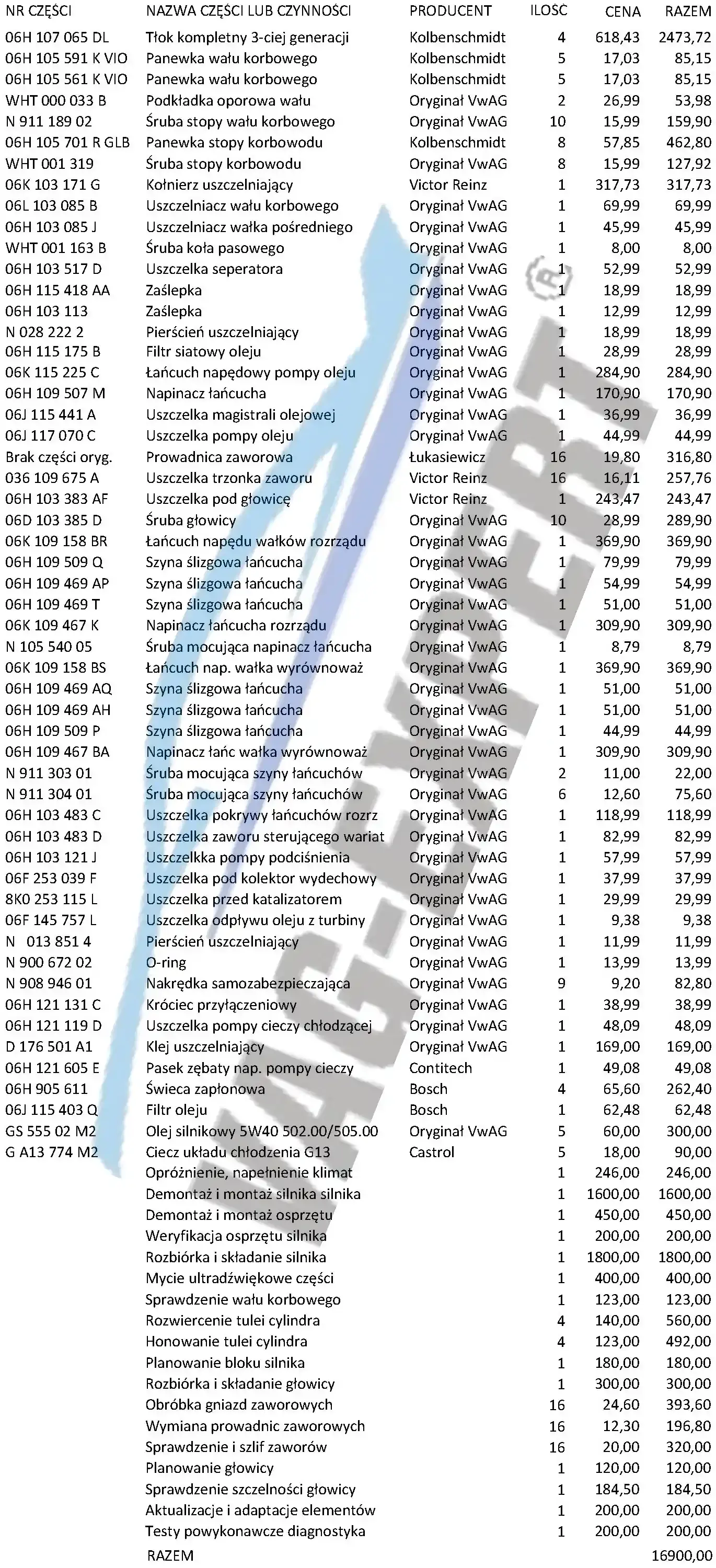 Nachfolgend finden Sie eine Liste der ausgetauschten Teile und der durchgeführten Arbeiten während der Überholung eines TSI/TFSI Motors mit dem Problem des übermäßigen Ölverbrauchs. Diese Liste bezieht sich auf eine typische Motorüberholung, bei der der Motor viel Öl verbraucht, aber noch nicht festgefahren ist oder bei dem der Zahnriemen nicht übersprungen hat. Bei einem festgefahrenen Motor oder einem mit beschädigtem Zahnriemen werden die Reparaturkosten aufgrund zusätzlich beschädigter Teile höher sein. Es kommt vor, dass während der Reparatur (nach dem Zerlegen des Motors) zusätzliche Teile ausgetauscht werden müssen, die nicht in der untenstehenden Liste aufgeführt sind. Einige Teilenummern variieren je nach Motorkennung und Produktionsjahr, aber ihre Preise sind gleich.